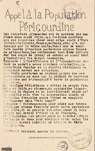 Le Tract du MNCR ci-dessous, dénonce le racisme ainsi que l'antisémitisme. (Tract du MNCR (Mouvement national contre le racisme) distribué à Périgueux. (1 W 1803))