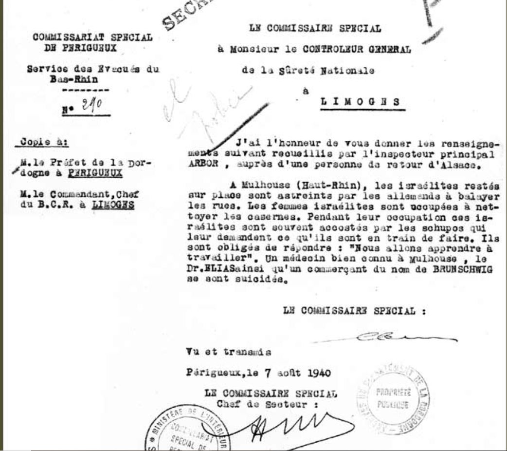 Dans le premier document du site des archives départementales de Périgueux, le préfet de la Dordogne s'adresse aux sous-préfets de Bergerac, de Nontron et de Sarlat, aux maires du département de la Dordogne (en zone libre) ainsi qu'à ceux des cantons de Pujols et Ste-Foy-la-Grande (Gironde non occupée).